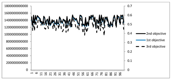 To assure the convergence of the proposed algorithm, with its tuned parameters, the above problem is repetitively solved 100 times. Figure 8 illustrates the obtained results of the solutions for different objectives. According to this figure, it is clear that the algorithm-proposed solution in all of the objectives represents a controllable variance, and it can be considered as the proposed algorithm reliability. No outlier solutions can be detected in repetitions.