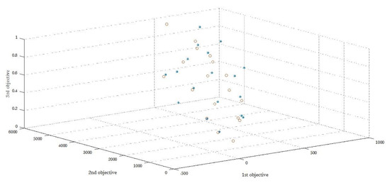 As demonstrated, with the decrease in the average demand, the value of the objective function decreased. By virtue of shipping costs, other items are reduced by decreasing demand. In Figure 4, the stars represent the Pareto before the change, and the circles represent the Pareto after the change.