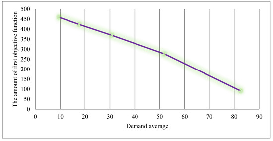 To investigate how the values of the objective functions varied, sensitivity analysis should be performed on some of the parameters. Regarding the multiplicity of the model, two types of analysis are performed. The first type is the change in Pareto’s values relative to the change in one of the parameters. In the present study, this type of analysis—as compared to the change in the demand parameter in the initial model, which decreased by 10%—and the results of this sensitivity analysis are shown in Table 17 and Figure 9.