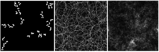 At any rate, the adhesion model is not meant to describe accurately the formation of singularities, even within Newtonian gravitation. Gurevich and Zybin’s specific approach to this process (within Newtonian gravitation) [37] obtains different results, namely the formation of singular power-law mass concentrations instead of the collapse of a number of dimensions (one, two or three) to zero size. Singular power-law mass concentrations are the hallmark of typical multifractals. On the other hand, multifractals are the natural generalization of simple hierarchical mass distributions, namely simple fractal sets, also referred to as monofractal distributions. Therefore, we are led to study the geometry of multifractal mass distributions and the proper way to characterize them [35]. Examples of monofractal, multifractal and adhesion model web structures are shown in Figure 1.