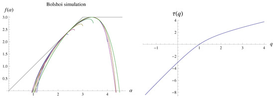 A number of multifractal analyses of the cosmic mass distribution were made years ago [11,12,40,41,42]. However, the quality of the data then was not sufficient to obtain reliable results. I have carried out multifractal analyses of the mass distribution in recent several N-body simulations, which have consistently yielded the same shape of the multifractal spectrum. Probably, the most interesting results to quote are the most recent ones, from the Bolshoi simulation [35,67]. This simulation has very good mass resolution of the cosmic structure: it contains particles in a volume of [h is the Hubble constant normalized to 100 km/(s Mpc)]; so that each particle represents a mass of , which is the mass of a small galaxy. Therefore, it is possible to establish convergence of several coarse-grained spectra to a limit function, as the coarse-graining length is shrunk to its minimum value available in the particle distribution. Actually, the shape of the multifractal spectrum is stable along a considerable range of scales, proving the self-similarity of the mass distribution (Figure 2). It is to be noticed that the Bolshoi simulation only describes dark matter particles. However, the Mare-Nostrum simulation describes both dark matter and baryon gas particles and gives essentially the same results [68].