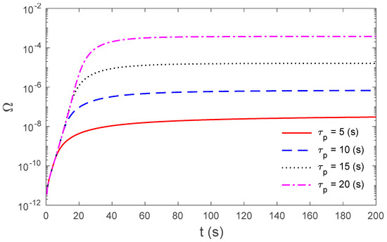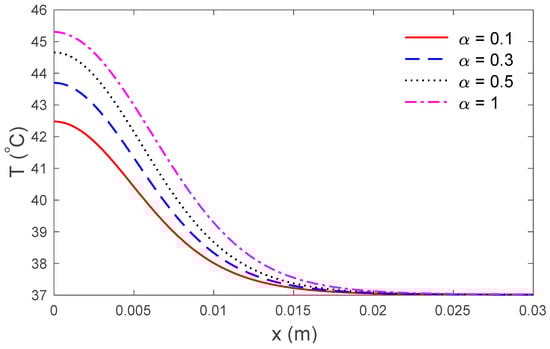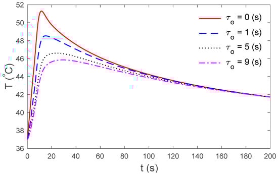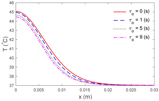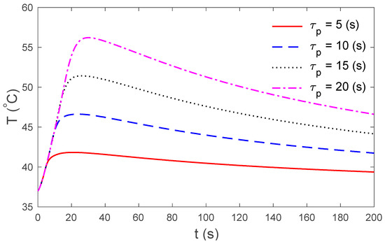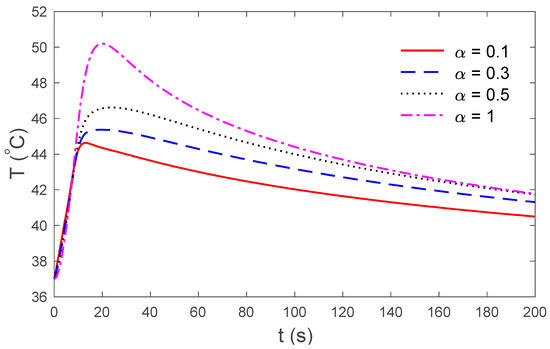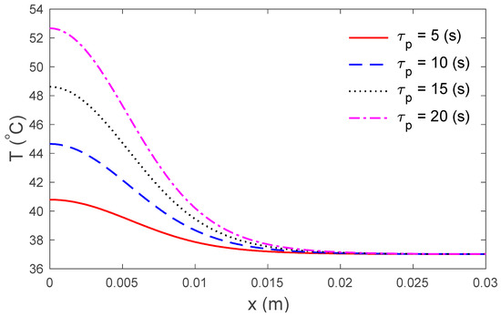 Using MATLAB (R2017a) software, the computations are done and the results are presented graphically. The outer thermal source impact on the surface of the skin was integrated. These mathematical models, which are based on hyperbolic bio-heat transfer, were found with the interface and appropriate boundary conditions. The perfusions, metabolic, and conducting heat source terms were utilized in the formulations. A slab of tissue is 3 cm thick and the reference temperature is equal to its normal temperature, that is, . In order to study the effect of fractional parameter , the laser exposure time and the thermal relaxation time on the temperature and the thermal damages, the numerical results were presented using the graphs as in Figure 1, Figure 2, Figure 3, Figure 4, Figure 5, Figure 6, Figure 7, Figure 8 and Figure 9. Figure 1 displays the temperature variation along the distance at when the laser exposure and thermal relaxation times remine to constants . It is observed that the temperature begins from the utmost values, and then decreases constantly to . The time history of surface temperature through four values of the fractional order parameter is exhibited in Figure 2. It notices that the temperature begins from and increases with the time till most values, after which decreases again to . Figure 3 show the resulting thermal damage through time . Clearly, the time history of the thermal damages obtained from the different values of the fractional order parameter is very different. As expect, the fractional order parameter has major effects on the distributions of the variables. Figure 4, Figure 5 and Figure 6 display the influences of the laser exposure time with the fractional bioheat model ( on the resulting thermal damage and the temperature distributions. As expected, the laser exposure time has a great effect on the resulting thermal damages and the distribution of temperature. As expected, the increase of laser exposure times increases the temperature, exceptionally at the peak temperature where the difference between the diagrams. On the basis of the fractional order bioheat model (, the comparison of temperature response among four types of thermal relaxation time along x is shown in Figure 7. In these cases, it was observed that the thermal relaxation time decreases the temperature of the skin surface. Gradually, the temperature decreases continuously to the normal temperature. The time history of surface temperature through four values of the thermal relaxation time is shown in Figure 8. Moreover, Figure 9 displays the variations of thermal damages with time for various values of thermal relaxation time . Figure 3, Figure 6 and Figure 9 show the variations of thermal damage at the point under various values of the fractional parameter, the laser exposure time, and the thermal relaxation time, respectively. As observed in the figures, the thermal damages are reduced with the fractional model and hyperbolic bioheat model.