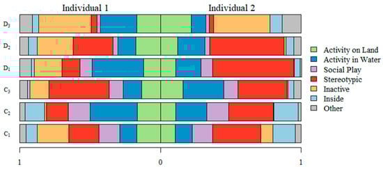 When comparing the asymmetry indices of the two treatments, results varied greatly for both individuals in terms of the asymmetry index between the two treatments (Figure 2) (see Appendix D). Significant differences between the asymmetry indices of the two treatments were found for the behaviors ‘stereotypic’, ‘inactive’ and ‘inside’ of individual 1 (p < 0.05), whereas for individual 2 it was only the behavior ‘inside’ that showed a significant difference (p < 0.01). A significant difference between the individuals for treatment D for ‘activity in water’ was also found, where individual 2 had a significant higher asymmetry index than individual 1 (p < 0.05). Furthermore, no significant differences were found between the two individuals for either of the two treatments (see Appendix D).