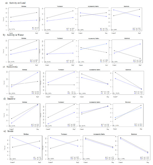 Similar to the asymmetry indices, great variation in whether the slope was positive or negative when comparing the kurtoses of the two treatments was also found for the different behaviors (Figure 2) (see Appendix D). For all behaviors, significant differences were found between the kurtoses of the two treatments for both individuals (p < 0.001). When comparing the kurtoses of the two individuals for treatment C, significant differences were found for the behaviors ‘activity on land’ and ‘stereotypic’ (p < 0.01) (see Appendix D). For treatment D, significant differences were found between the kurtoses of the two individuals for the behaviors ‘activity on land’ and ‘activity in water’ (p < 0.001) (see Appendix D).