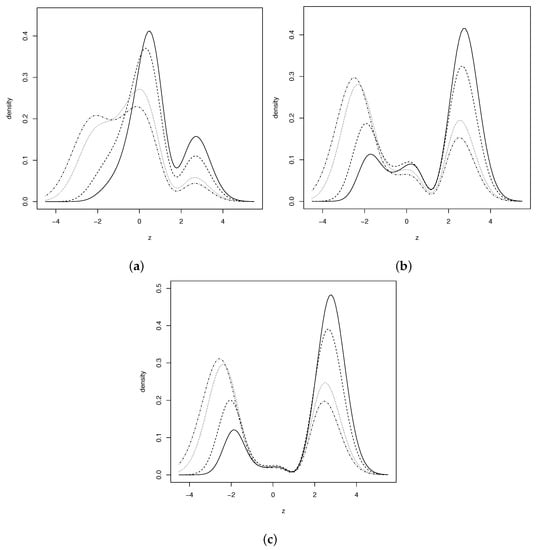 Density function of distribution. (a) for (dotted-dashed line), (dotted line), (dashed line) and (solid line). (b) for (dotted-dashed line), (dotted line), (dashed line) and (solid line). (c) for (dotted-dashed line), (dotted line), (dashed line) and (solid line).