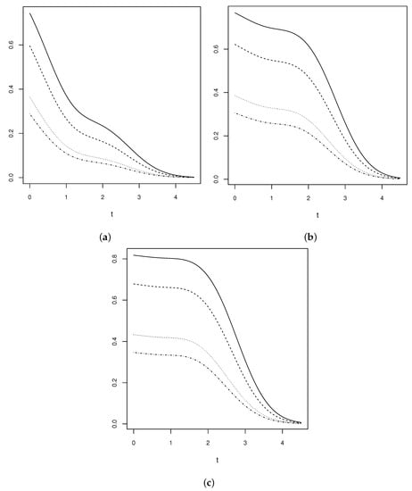 Survival function of distribution. (a) for (dotted-dashed line), (dotted line), (dashed line) and (solid line). (b) for (dotted-dashed line), (dotted line), (dashed line) and (solid line). (c) for (dotted-dashed line), (dotted line), (dashed line) and (solid line).