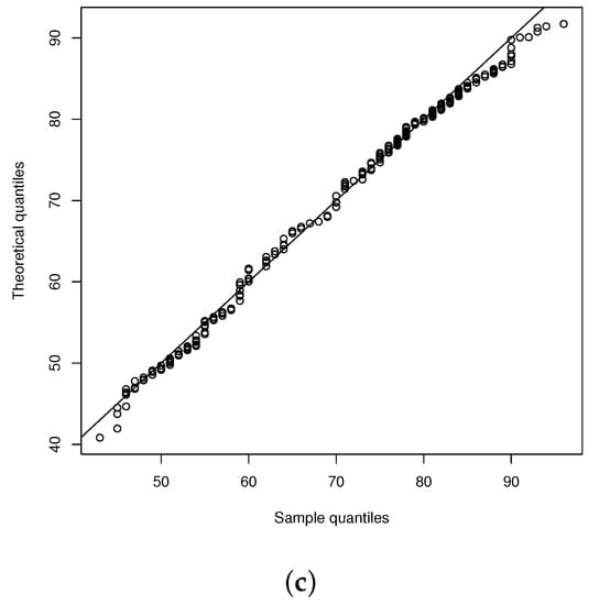 where and denote the likelihood functions of the BSN and BSAP models, respectively. We obtain the value , and comparing this quantity with , the null hypotheses is rejected, that is, the BSAP model is more flexible than the asymmetric BSN model, taking into account the test results of Hartigan and Hartigann [20] and Hartigan [21].
