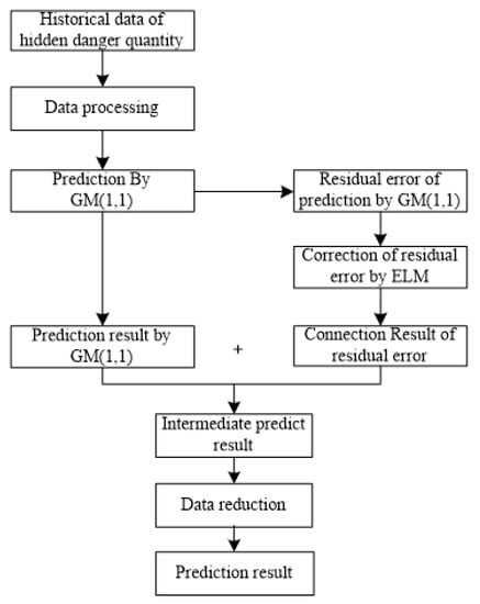 From the formation and development mechanism of hidden dangers, it can be known that, hidden dangers appear random, uncertain, and sudden, but they are by nature regular and predictable. Due to their uncertainty, this paper at first employs the gray system theory to probe into the time law of hidden danger quantity, and to predict their change trend. Subsequently, a gray prediction model for hidden danger quantity is established. Then, as to their randomness, the paper adopts the extreme learning machine to correct the residual error of the gray prediction model. The prediction principle is illustrated in Figure 2.