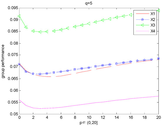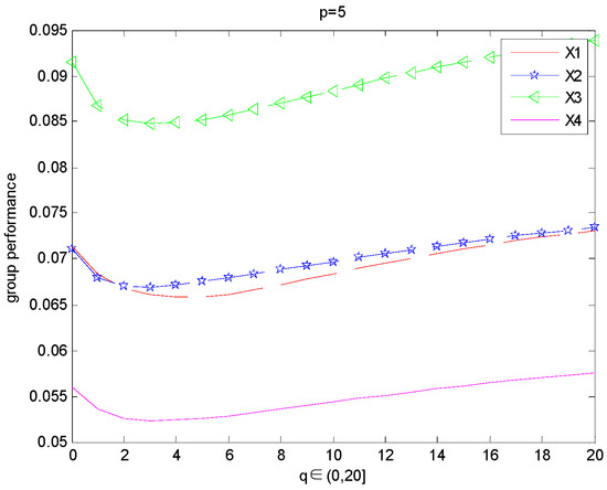 As shown in Table 16, when the number of attributes is 5 in the original case, the sorting results of the three methods are consistent. However, with the increasing number of attributes, the order of the SIR Choquet method [19] and GLWBM operator [33] changes. The order of the GLWBM operator fluctuates greatly. When the number of GLWBM operators increases to six attributes, the calculated order becomes ; when the attribute variable reaches eight, the permutation order becomes . The order of the SIR Choquet method changes when the number of attributes is seven, and when the number of attributes is eight, the order changes back to the original order. However, the order of IGTFWPBM operator has not changed, because IGTFWPBM operator can fully consider the interrelationship among attributes variables through classifying attributes for calculation, which greatly improves the accuracy and stability of the decision-making process. At the same time, in the calculation of IGTFWPBM operator, the decision-maker can adjust the parameters p and q to show his or her attitude towards the internal grouping relationship among attributes, which is more consistent with the actual decision-making process.