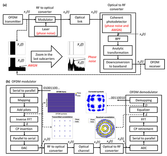 CO-OFDM is realized via the OFDM modulation in the optical domain accompanied by the coherent detection. As mentioned in the Section 1, it exposes excellent results in terms of the receiver sensitivity and spectral efficiency. Figure 1a shows a simplified model of a CO-OFDM system [28], which consists of five parts: an OFDM modulator, a RF to optical upconverter, a fiber link, an optical to RF down-converter, and an OFDM demodulator.