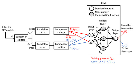 In this work, the ELM architecture consists of 2 real input (one for the real part and one for the imaginary part of the points in the constellation), L neurons in the hidden layer defined in the real domain, and 1 complex output (the constellation symbol), see Figure 2 where constants and variables may be identified. After the FFT module, pilot and data subcarriers are separated as well as serialized to accelerate and reinforce the learning procedure. The real-complex (RC) ELM by assuming the pilot subcarriers as training data is introduced for the first time since it could be directly extended to a semisupervised machine learning algorithm [41,42] for enhancing the system performance, but its realization is left for future research. Remember that the origin of phase error in the diverse subcarriers comes from the same oscillators and, hence, the inclusion of some data in the training step should be an overall positive impact. In addition, the conditions of the input weight vectors and biases based on a certain activation function in the complex plane (a fully-complex ELM) [18,19] do not occur in the RC-ELM where a real activation function is considered, by facilitating its realization. Consequently, the output weights thanks to pilot subcarriers acquire the form of: