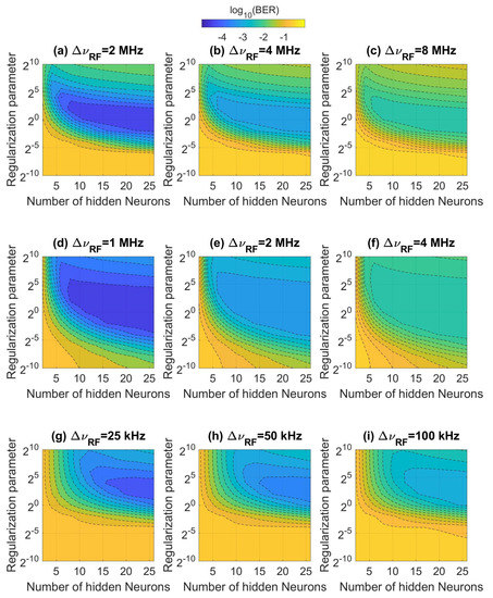 Taking into account the SIG activation function, Figure 3 depicts the contour plots of the BER metric as a function of the regularization parameter and number of hidden neurons according to (a–c) BPSK, (d–f) QPSK, and (g–i) 16QAM constellations. This function guarantees the universal approximation capability of SLFNs under any learning algorithm, such as the ELM [10,20]. Throughout the manuscript, the input weights and biases are generated from the range based on uniform distribution [24,41]. For each subcarrier modulation format, three outcomes are observed by varying the RF linewidth. As mentioned, the linewidth parameter depends on the number of points in the constellation to determine the system performance around the FEC limit. The BER deteriorates as the bandwidth narrows and the laser phase noise increases, just meaning that a format with higher bit-rate efficiency needs more pure subcarriers at the frequency domain. In detail, the penalty of the adoption of a certain subcarrier modulation format in the BER metric is explained later through normalized linewidths for realizing overall conclusions. For each symbol constellation and phase-noise level, the superior success rate in the testing stage happens in an irregular region dependent on the ELM parameters. In general terms, for coefficient penalties between and and number hidden nodes greater than the number learning samples (pilot subcarriers), the system performance exhibits important enhancement. The highlighted zone in terms of the BER extends for broad lasers. In the following, as well as are adopted as sub-optimal parameters in order to convert these invariants to the symbol constellation and/or mixed linewidth, and get away from the boundaries of the BER degradation.