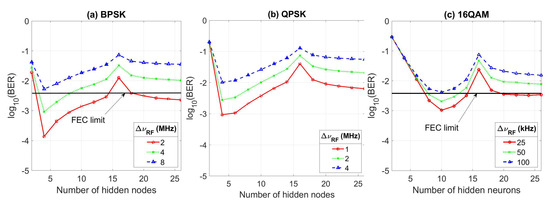 According to (a) BPSK, (b) QPSK, and (c) 16QAM constellations, the bit error rate (BER) in terms of the number of hidden nodes with the combined linewidth as parameter. The penalty coefficient is not considered.