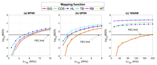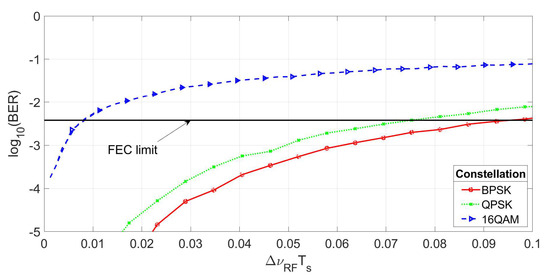 Finally, the BER in terms of the product between the RF linewidth and the OFDM symbol period for the studied subcarrier modulation formats is displayed in Figure 7. This normalization is done in order to clearly establish the cost of increasing the spectral efficiency on the system performance as long as the bit rate remains constant. For BERs below the FEC threshold (a successfully communication), the RF linewidth decreases by a factor close to 2 and 20 times from BPSK to QPSK and from QPSK to 16 QAM, respectively. These relationships tend to reduce as the BER reaches the FEC limit, which can be attributed to the ELM behavior as the constellation alphabet and phase-noise level augment. Because the system performance of phase-uncorrelated OFDM signals depends on the relationship between the RF linewidth and OFDM symbol period for a certain subcarrier modulation format [2,3,7], this outcome and the rest of observations along the paper are useful for the design and implementation of CO-OFDM schemes.