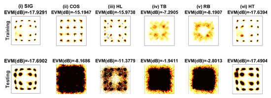 Figure 5 afterward illustrates the BER as a function of the RF linewidth with the most used activation function as parameter (see Table 1) for the studied subcarrier modulation formats. The impact of the activation function on the system performance augments as the constellation symbols increase and/or phase noise becomes more predominant, where the SIG function outperforms the rest of the functions. The HT function, which is also SIG (s-shaped), has practically the same behavior that the SIG function. In the same context, the worst activation function depends on the number of points in the constellation. For example, the HL and TB functions provide poor results for the BPSK and QPSK modes, respectively. If the equalizer outcome will be a real number, these observations could be attributed to the testing root mean square error, which is commonly used to quantify the effectiveness of any classifier or regressors [10,11,12,14,15,16,17,20,41,42]. Unfortunately, the proposed phase-noise suppression technique provides an output in the complex plane (the points in the constellation). The root mean square EVM is hence employed. It manages to measure how far a symbol constellation is from its perfect location in telecommunication networks [45,46]. In Figure 6, histogram constellations together with EVM values at training as well as testing stages are displayed. For the sake of illustration, the subcarrier modulation format and combined linewidth correspond to 16QAM and 100 kHz, respectively. It can be seen that EVMs in the testing phase explain the superiority in terms of the BER of SIG and HT functions, whose constellations manifest low dispersion. At the same time, the poor results by the use of TB and RB functions make sense, whose constellation shapes do not remain. To further gain insight on the explanation behind these performances, the histogram constellation in the learning stage for each activation function is exposed. While SIG and HT functions present the most regular constellations, the other functions are characterized by scattered symbols; the EVM metric obviously affirms this note. In the rest of the paper, the SIG as activation function is adopted.