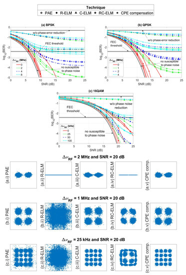 A better understanding of the performance behavior may be accomplished by studying the constellations (after the PAE, R-ELC, C-ELM, RC-ELM, or CPE compensation) for (a) BPSK, (b) QPSK, and (c) 16QAM subcarrier modulation formats, refer to Figure 8. For that end, the SNR value is fixed to 20 dB and the RF-linewidth parameter varies as a function of the modulation in order to clearly perceive the system deterioration. Looking at the point dispersion, it can be seen that whereas for the CPE compensation, the constellation shape remains notorious, the R-ELM practically leads to a stain. The PAE, C-ELM, and CPE compensation produce quasi-circular constellations for all subcarrier modulation formats. Their symbols then suffer a uniform distortion and standard decision regions do not affect the system performance. On the other hand, the constellation shape of the novel ELM changes as a function of its number of symbols. The constellation degradation only happens in the real dimension for BPSK. While the variance noise comes from a non-Gaussian distribution in the QPSK constellation. Finally, the constellation dispersion in 16QAM is determined by the symbol power as follows: the inner points seem to possess a Gaussian degradation, in contrast to the symbol shapes in the periphery that are elliptical with semi-minor and semi-major axes dependent on the magnitude of the complex point. Consequently, in order to broaden the laser oscillators in CO-OFDM schemes, the RC-ELM should be included the demapping process by providing non-rectangular boundaries. However, this improved ELM is left as a pending task.