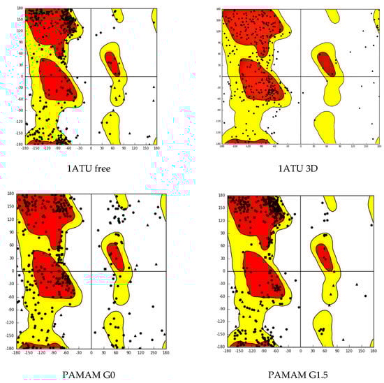 Ramachandran plot for 1ATU free, 1ATUG0, 1ATUG1.5, and 1ATU, respectively, are represented in Figure 2.