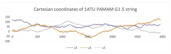 The Cartesian coordinate obtained for all the structures are represented by a scatter plot (Figure 3). For each diagram, three logarithmic equations for the x, y, and z coordinates were calculated. Such a scatter plot is represented here for the PAMAM G1.5 string (see the rest of the graphs in Supplementary Materials).