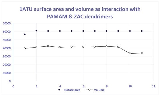 Surface area and volume of 1ATU protein string in the presence of different dendrimers layers. Ox axis, according with the entries on Table 1: 1—PAMAM generation 0, 2—PAMAM generation 1, 3—PAMAM generation 1.5, 4—PAMAM generation 2, 5—PAMAM generation 3, 6—C16H28N2O4, 7—C20H36N2O4, 8—C22H40N2O4, 9—C24H45N3O6, 10—C28H52N2O4, 11—1ATU Free, 12—1ATU 3D. Oy axis: Surface area (Å2) and Volume (Å3).