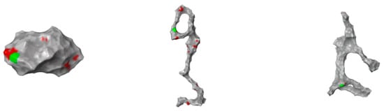Structure of 1ATU (from top to bottom): “native” (top); “free” (with no protein interaction—middle) and G1.5 (with G1.5 PMAM interaction—bottom). Aggregation surface was calculated; all of the Aa domains that may contribute to an aggregation process are represented in red; Aa with the highest score, the chance to produce an aggregation is represented in green. For each protein string, a distinct Aa set is identified accordingly to the string’s geometry.