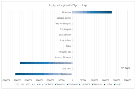Figure 12 shows some distinct molecular descriptors computed for the studied compounds. Molecular descriptors are designed to retrieve a distinct number for each structure that is computed, which means that even for small structures, molecular descriptors are composed of 3–4 digits. When computed for a structure (i.e., 1ATU) that contains 2962 atoms, such big numbers are retrieved.
