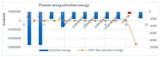 In Figure 13, solvation energy is represented. While the protein string is of interest, solvation energies are computed in a closed system. In this case, the computations show high numbers in order to detect, even the smaller difference in protein string energy, while the same structure (same molecular formula) is computed. As expected, the 3D structure (1ATU) has the smallest solvation energy, i.e., is more solvable that the rest of the members. In the rest, protein strings resulted as the interaction of 1ATU with dendrimers monolayer have disproportionately higher solvation energies, i.e., hundreds of times more susceptible to protein denaturation and aggregation in the solvent while in contact with dendrimers monolayer.