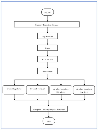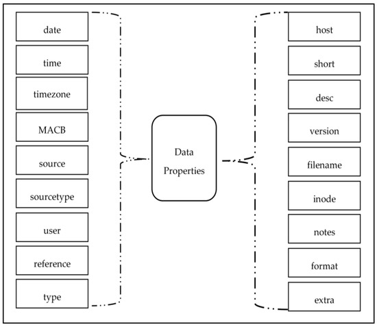 In this section, the first methodology for reconstruction of the timeline in digital forensics [26] is discussed. This approach is based on the outcome of the digital forensics command based tools, i.e., Log2timeline and Psort. The Log2timeline tool was used to generate timeline from a disk image file or other sources of data in the .plaso file format, which was sorted out and converted into a familiar format file format such as CSV by Psort in the form of L2TCSV format, i.e., Log2timeline Comma Separated Values. The L2TCSV file contained 17 distinct fields which provided vital and detailed information related to various activities performed by the user on the typical device in the form of a timeline of events and artifacts. So, these fields were defined as data properties in the novel ontology, as shown in Figure 2. The abstraction-based approach used one of the properties of an object-oriented programming language called abstraction, which also follows the definition of symmetry in software. This approach split the timeline into four distinct levels of abstraction, i.e., events: high level, events: low level, artifact location: high level, and artifact location: low level. The concept/objective behind the four levels of abstraction was to follow a specific structure for all sources at each level to compose a uniform and relevant timeline. The specific structure imposed the correctness of the timeline and contained only information that was useful to recognize and interpret actions performed by users by analyzing distinct sources and fields. At the time of timeline reconstruction, numerous new terminologies or concepts were encountered. For this, a novel ontology for digital forensics was developed.