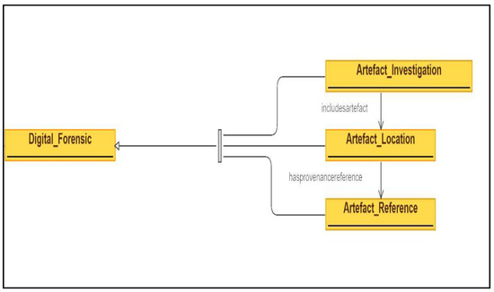 Lastly, an individual instance of the classes was defined, the value filled into the slot, and restrictions were defined to create a knowledge base. In the developed ontology, the top-down approach was used to define the classes and organize the taxonomy of classes. It begins with the explanation of the most general concepts in the domain, followed by an explanation of specialization concepts. Digital _Forensics is a base class which represents the general concept in the forensics domain for which ontology is being developed to defined common vocabulary, share information, and reuse and analyze domain knowledge. From the base class, three subclasses are defined to represent more specific concepts of the digital forensics domain: Artefact_Investigation, Artefact_Location, and Artefact_Reference. To show the relationship between these classes two object properties are defined such as includesartefact and hasprovenancereference as shown in Figure 4, and to show the relationship between an instance or an individual and a data value, 18 data properties were defined as shown in Figure 2.