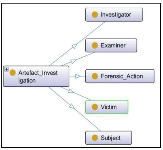 The first sub-class Artefact_Investigation defines the basic terms related to the digital forensics process, and different actions are to be taken at various stages by different specialists during the investigation of the case. In ontology, each concept is described by defining a class. To define the sub-terms related to the Artefact_Investigation subclass, new subclasses were defined as shown in Figure 5. A digital attack is committed against an individual or group of individuals (the victim) intentionally with a criminal motive to harm physically or mentally.