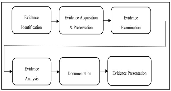 Forensic_Action represents a recognized scientific and forensics process used by digital practitioners in digital forensics investigations to collect the evidence from digital devices. It is a multiphase process beginning from the recognition of digital devices as potential digital evidence to the stage where it is demonstrated as evidence in a court of law. The sequence of the various phases of the digital forensics process is shown in Figure 6 [27]. The forensics investigator is the person who is initially responsible for examining the captured evidence from the scene of the incident. The investigator documents the several types of captured data and provides research on the parameters and technical specifications of the data storage devices, and details of various data components of the evidence as it is presented to him by the data capture specialist. Then the forensics investigator provides his/her report in the form of evidence to the forensics examiner who is independently responsible for analyzing this evidence. The forensic examiner job is to provide logical conclusions about the dataset and what it reveals as to the nature and purpose of the evidence.