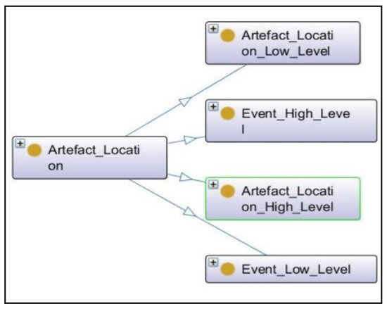 The results showed that there were four terminologies encountered in the Android-based system timeline, which were described as subclasses of the Artefact_Reference subclass in the ontology of the Android-based system, as shown in Figure 13. The three subclasses “OLECF”, “META”, and “PE”, excluding subclass “FILE”, provided the same information which was described above (see Table 1). The two new subclasses “Application” and “Browsing_History” of the subclass “FILE” were explicitly defined to show the information about user browsing activities as there was no information implicitly available in the timeline for browsing activities.