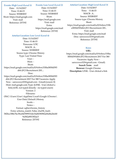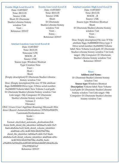 At events: Low level detailed information is provided related to distinct categories of activities that are performed by the user related to file such as modification, access, changes and birth, and web surfing activities. It also includes the address of particular web pages that are accessed by user and download of information from the web. At this level, seven different fields are considered to compose timeline. The first two levels, i.e., events: high level and events: low level, provides information related to only user activities. To have a clear view of timeline and activities additional information is required such as a list of all executable files executed by a user, applications and files that are regularly accessed by user and authors of files. Besides, detailed information is also provided related to distinct activities performed by the user on the web. For example, in the case of web browsing activity, the detailed information will include the name of used web browser and how (LNK—user follows a link, TYPED—user type the URL, RELOAD—user refresh the web page) web page is accessed. Such detailed and relevant information is provided at artifact location: high level and artifact location: low level by analyzing 10 and 17 fields respectively.