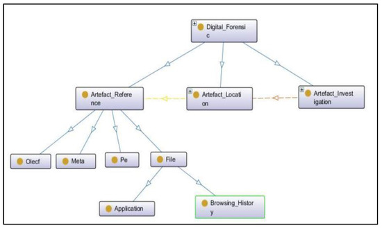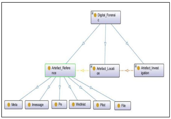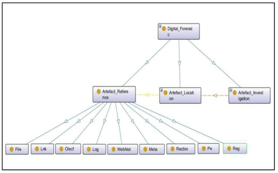 We designed an ontology based on the outcome of the approach to define new terminologies and relationships among them. It included classes, object properties, and data properties where a class described a new concept or term in the domain, object properties defined the relationship among instances or individuals of different classes, and data properties described the relationship among instances and data values. The results showed that there were nine new terminologies encountered in the Windows-based system timeline, which were described as subclasses of the Artefact_Reference subclass in the ontology of the Windows-based system, as shown in Figure 10. Each terminology represents the source of different information related to different actions performed on the Windows-based system. It includes information related to online operations, offline operations, frequently accessed applications and files, deleted files, and many more. A short description of each subclass is defined in Table 1.