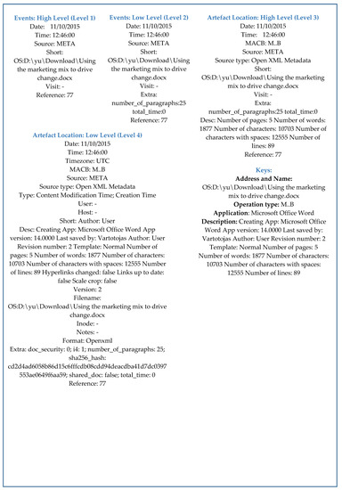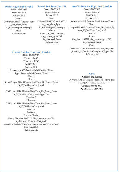 In this section, two case studies of the Android timeline are discussed, namely data about data, i.e., the “META” source and “FILE” source. As with the Windows operating system, the Android operating system also considered the same number of data properties (fields) at each level of the abstraction based approach to compose a structured timeline. Figure 11 presents the four levels of abstraction of the timeline of the “META” source. The first level, i.e., event: high level, provides brief information such as name, type, and storage location of a particular file. The event: low level and artifact location: high level provide additional information related to contents of a file such as number of words, number of characters, and much more. Artifact location: low level provides vital and useful information related to a particular file such as author name and name of the application used to access, change, or modify the file. In Figure 12, the four levels of abstraction of timelines of the source “FILE” are presented. In this study case, information about a particular file was provided at a different level of the timeline with a distinct level of abstraction of detail. It included name (Tum_Ho_Mera_Pyar-K_K(DesiTape.Com).mp3), type (audio), and size (about 2.16 MB) of the file and much more.
