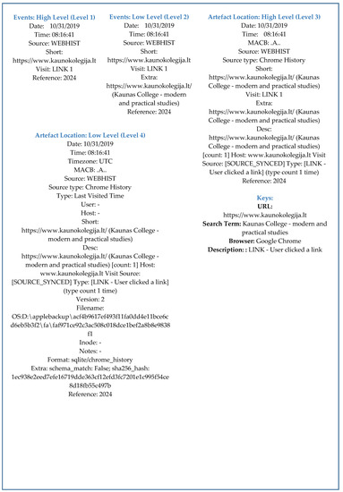 - Bhandari, S.; Jusas, V. An abstraction based approach for reconstruction of timeline in digital forensics. Symmetry 2020, 12, 104. [Google Scholar] [CrossRef]