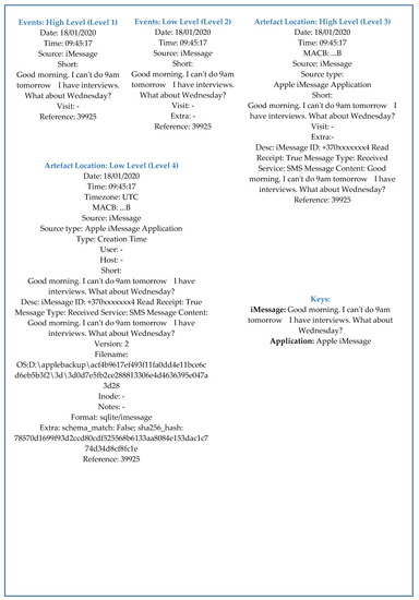 In this section, the two case studies of the iPhone timeline are discussed, such as web browsing activity (WEBHSIT) and local operation (iMessage) performed by a user. In the first study case, i.e., web browsing activity, each level of the approach provided information related to specific web activity with different levels of abstraction of detail. It included the web address, the browser used to access a particular web page and how, i.e., either user typed the address in the address bar or clicked a link, as shown in Figure 14 The second study case, i.e., timeline of local operation, provided information related to an activity which was performed locally on the device without the usage of internet, as shown in Figure 15. It included vital information such as contact number, mailing address, and much more.