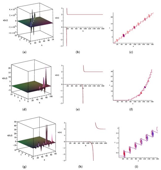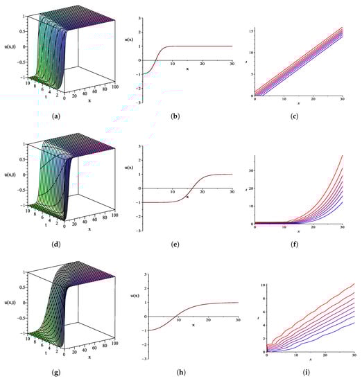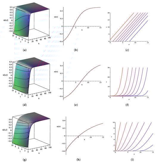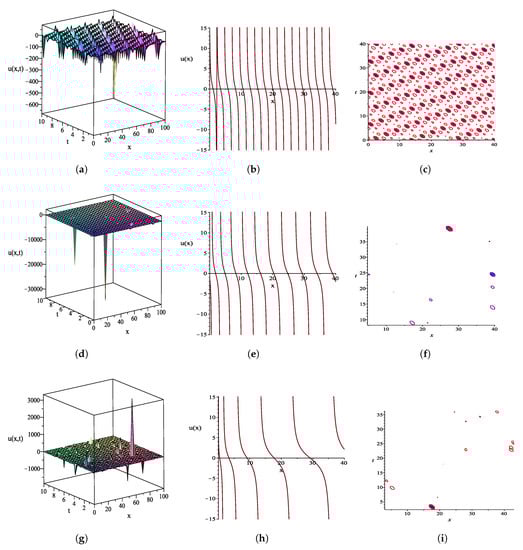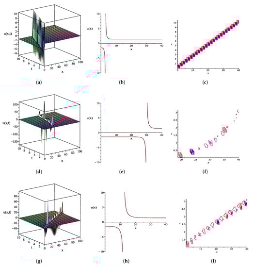 Associated plots of u(x, t) in Equation (113): (a–c) 3-D plot, 2-D plot, and contour plot, respectively, when ; (d–f) 3-D plot, 2-D plot, and contour plot, respectively, when ; (g–i) 3-D plot, 2-D plot, and contour plot, respectively, when .
