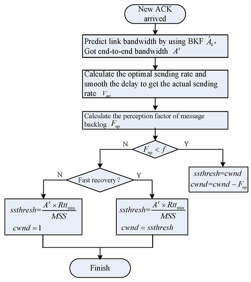 To increase the performance in a wireless network, researchers have presented many strategies of congestion control protocol. These strategies can be categorized according to the technique they employ. In [14], the bandwidth was estimated in real time based on the amount of data confirmed in the round trip time (RTT), and filtering and smoothing were used to obtain a more accurate bandwidth value. The bandwidth utilization was used to first analyze the reason for packet loss and the degree of congestion, and then adaptively adjusted the congestion parameters dynamically. In [15], the available bandwidth of a node was monitored in real time, and the congestion level indicator of a node was constructed. The slow start threshold and the size of the congestion window were set on the basis of the available bandwidth, and congestion control was achieved by distinguishing different types of packet loss. A new mechanism was proposed to set and during the congestion avoidance phase in [16]. The link bandwidth was detected by the number of bytes confirmed by two consecutive responses to reduce the slow startup time. It was presented to improve the bandwidth estimation based on the wireless link quality and the one-way delay change trend in [17]. A more reasonable congestion control would be realized on the basis of distinguishing packet loss. The random process characteristics of network traffic and statistical methods were used to estimate the available bandwidth in [18]. In [19], the impact of collision probability and frame synchronization on estimating the available bandwidth of the network was first considered. After that, the degree of dependence of the sender and receiver on the idle time was further evaluated, so that the available bandwidth estimation could be realized.