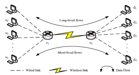Nodes represent the sending end of TCP, nodes are the routers of the backbone link, and nodes represent the receiving end of TCP. Figure 3 shows the dumbbell topology of the simulation. It was assumed that the bandwidth of the bottleneck link changes randomly according to the uniform distribution. The end-to-end aggregated File Transfer Protocol (FTP) data stream traversing the topology contains two types, namely long-life stream and short-life stream. In the simulation experiment, 10 long-life FTP flows passed through the bottleneck link in two directions, and 20 short-life FTP flows passed through the bottleneck link from the source to the destination from left to right. The simulation parameter settings are shown in Table 1.