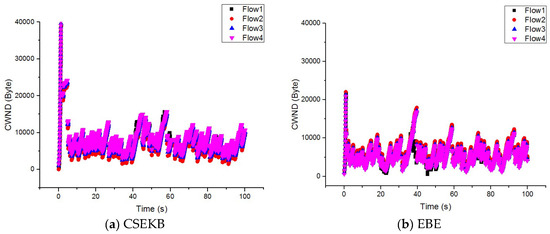 Figure 4a,b were obtained by statistically comparing the four long-life flows used by the CSEKB and EBE, and the dynamic changes of in the two protocols can be obtained from the figure. Figure 4c compares the variants in the average values of between the CSEKB and EBE. The CSEKB could maintain the average value of in a relatively high and stable region. In addition, it could adapt to the changes in the bandwidth of the wireless network, showing better responsiveness and efficiency. In contrast, when oscillated, the ability of EBE to efficiently regulate the value of was slightly insufficient.