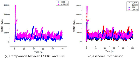 According to the network simulation environment described in Table 1, wireless network file transmission was performed using CSEKB, TCPW, CUBIC, and EBE, and the variants in the size of the congestion window were compared. The comparison results are shown in Figure 4.