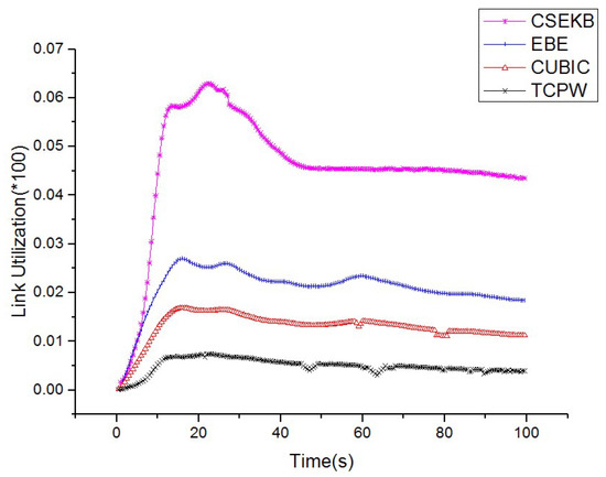 We now describe the comparison of bottleneck link utilization when using the CSEKB, EBE, CUBIC and TCPW protocols, which is shown in Figure 5. TCPW could not use the increased bottleneck bandwidth effectively and the aggregation was very slow, which is mainly due to the data stream being sent synchronously from 0 to 100 s. As the flows were generated in the range of 0 to 100 s asynchronously, and CUBIC could not capture the increased bandwidth in time, CUBIC converged very slowly. It should be noted, however, that despite the poor performance of CUBIC while the bandwidth increased, its utilization was still superior to TCPW by using the active detection of the available bandwidth. When there were link bandwidth variants, EBE could respond very quickly and achieved nearly double that of the utilization during the simulation period, indicating that it had better performance than CUBIC. In contrast to TCPW, although CUBIC and EBE significantly improved the utilization of bottleneck links, its utilization was still lower than that of CSEKB. In summary, even if the bandwidth of the wireless network is unstable, the CSEKB will still shows high bottleneck link utilization.