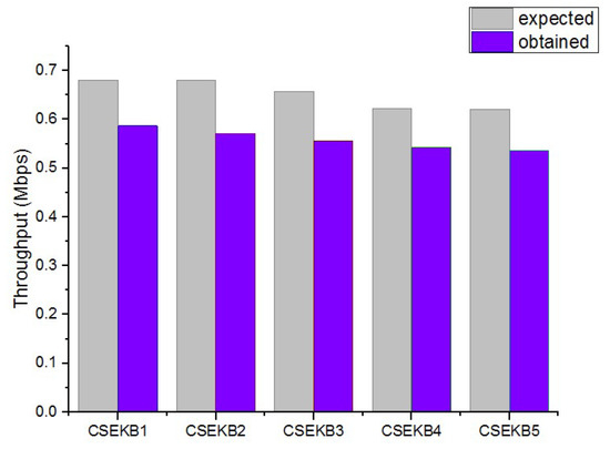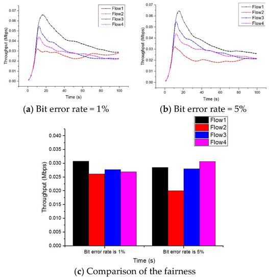 Fairness means that the bandwidth can be used evenly for each data stream in the CSEKB protocol. Moreover, it is not desirable that a certain data stream occupies a large amount of bandwidth while other data streams have no or only a small amount of bandwidth used. After a period of simulation, the average bandwidth of each data stream were obtained from the stable zone and compared. Figure 8 shows that under different circumstances of low error rate and high error rate, the throughput of each data stream in CSEKB was in the range of 0.02 Mbps–0.04 Mbps, with little difference. It can be concluded that the change of BER had little effect on the fairness of CSEKB. As the BER became larger, each data stream of CSEKB could still share the network bandwidth fairly, which proves that the CSEKB had better fairness.