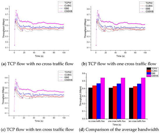 Figure 7 illustrates that when the number of cross traffic flow changed, the CSEKB could achieve higher throughput than EBE, CUBIC, and TCPW.