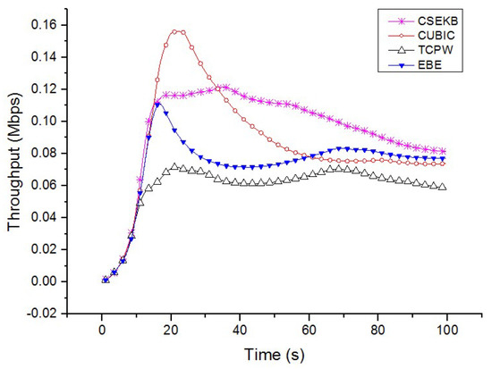 In the same simulation environment, FTP files were used to transfer 1 KB–150 KB files. At the same time, Wireshark analysis software was used to collect real-time throughput data in the network. The experimental results of comparing the CSEKB with TCPW, CUBIC and EBE are shown in Figure 6 and Figure 7.