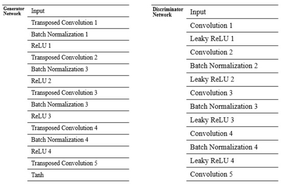 GANs consist of two different types of networks. Those networks are trained simultaneously. The first network is trained on image generation while the other is used for discrimination. GANs are considered a special type of deep learning models. The first network is the generator, while the second network is the discriminator. The generator network in this research consists of five transposed convolutional layers, four ReLU layers, four batch normalization layers, and Tanh Layer at the end of the model, while the discriminator network consists of five convolutional layers, four leaky ReLU, and three batch normalization layers. All the convolutional and transposed convolutional layers used the same window size of 4*4* pixel with 64 filters for each layer. Figure 5 presents the structure and the sequence of layers of the GAN network proposed in this research.