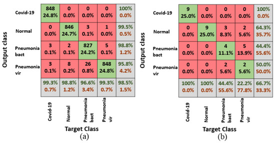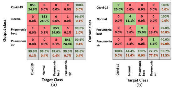 Confusion matrices of Googlenet for 4 classes (a) validation accuracy, and (b) testing accuracy.