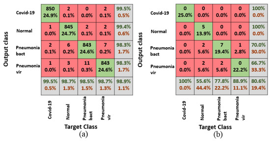 Confusion matrices of Alexnet for 4 classes (a) validation accuracy, and (b) testing accuracy.