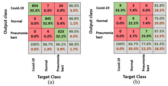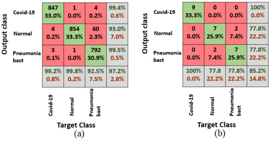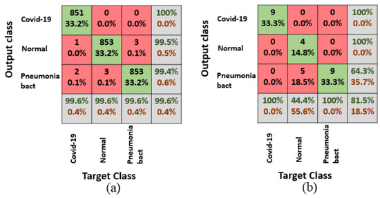 Confusion matrices of Alexnet for 3 classes (a) validation accuracy, and (b) testing accuracy.