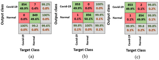 Confusion matrices the verification accuracy for (a) Alexnet, (b) Googlenet, and (c) Resnet.